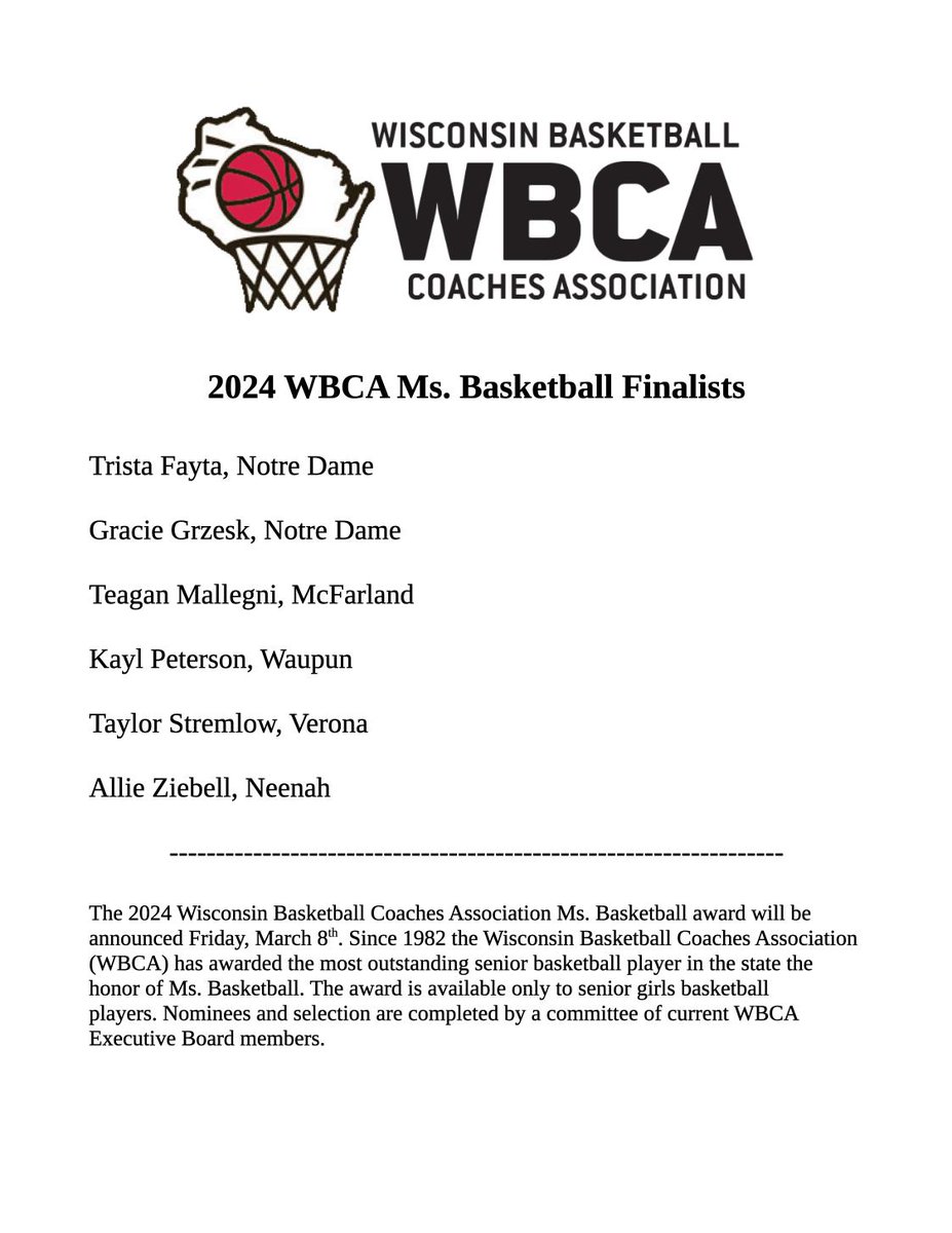 Source : www.wiaawi.orgWisBCA on X: “The WBCA is announcing the six finalists for the Ms