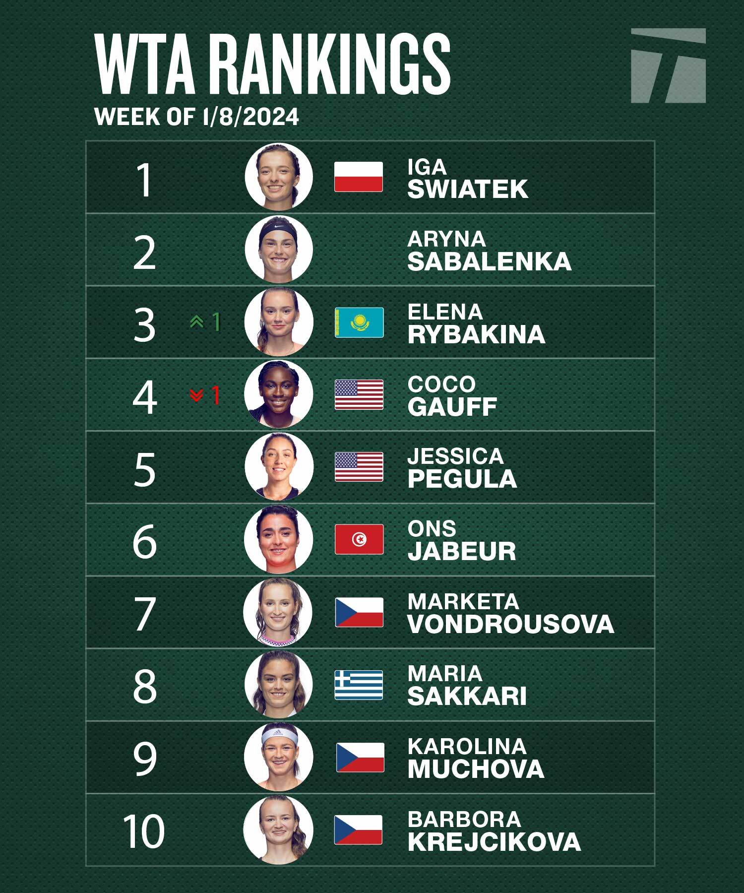 Source : www.wtatennis.comWTA Power Rankings | Australian Open 2024 | Swiatek, Sabalenka
